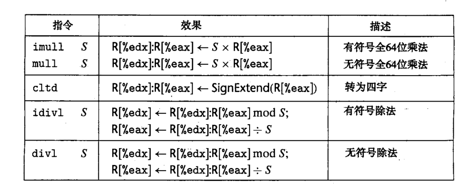 如上图,上面的几个指令支持有符号和无符号的全64位乘积以及整数除法,但是需要注意的是,存储结果的寄存器固定死了,是一对寄存器%edx(高32位)和%eax(低32位)组成的 64 位的四字。