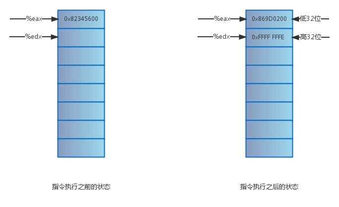 这里我们可以看一个实例:imull $0x3,我们假设此时%eax寄存器的值为0x82345600。也就是我们需要计算0x3*0x82345600的值,这里直接给出两者相乘的16进制表示,为0xFFFF FFFE 869D 0200。这个结果为64位的,因此我们寄存器的前后状态如下所示。