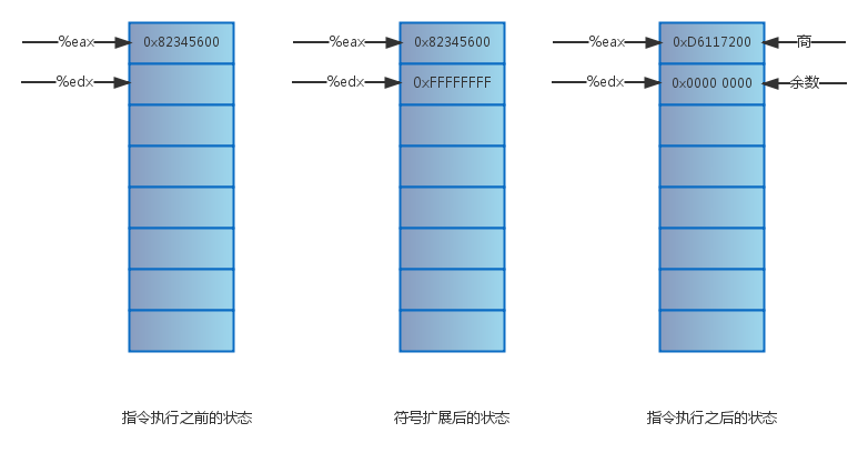 比如指令idivl $0x3的结果,我们假设此时%eax寄存器的值为0x82345600。也就是我们需要计算0x82345600/0x3的值,这里直接给出两者相除的16进制表示,商为0xD6117200,余数为0x0。因此我们寄存器的前后状态如下所示。
