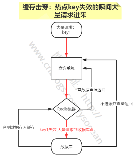 这里要注意的是这是某一个热点key过期失效,和后面介绍缓存雪崩是有区别的。比如淘宝双十一,对于某个特价热门的商品信息,缓存在Redis中,刚好0点,这个商品信息在Redis中过期查不到了,这时候大量的用户又同时正好访问这个商品,就会造成大量的请求同时到达数据库。