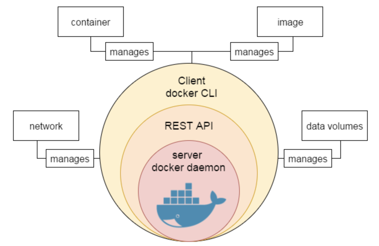 ③、docker CLI:表示Docker命令行接口,开发者可以在命令行中使用Docker相关指令与Docker守护进程进行交互,从而管理诸如image(镜像)、container(容器)、network(网络)和data volumes(数据卷)等实体。