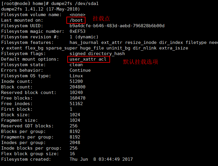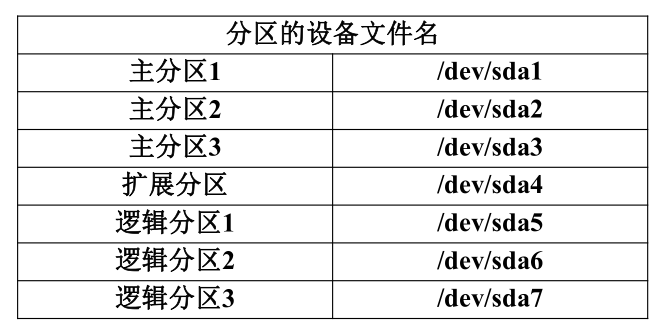 注意:如果只有一个主分区,一个扩展分区,扩展分区下有三个逻辑分区。那么主分区的设备文件名为/dev/sda1,扩展分区的设备文件名为 /dev/sda2。而逻辑分区直接是 /dev/sda5,也就是说系统默认的设备文件名从/dev/sda1——/dev/sda4是给主分区和扩展分区命名的,而逻辑分区的设备文件名是从/dev/sda5开始的。