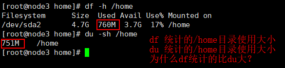 df 统计的/home分区使用大小为 760M,而du 命令统计的/home分区使用大小为 751M,这是为什么呢?