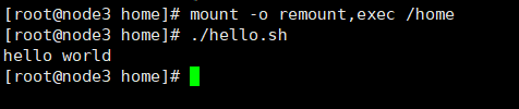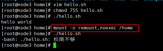 第二步:重新挂载 /home分区,加上 -o noexec,在执行此脚本发现权限不够了,注意我们还是使用的超级用户root