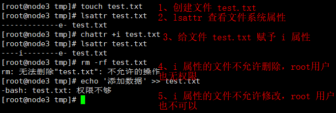 注意:chattr 限制权限之后,root 用户也不能例外。这个命令可以防止文件进行误操作。