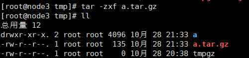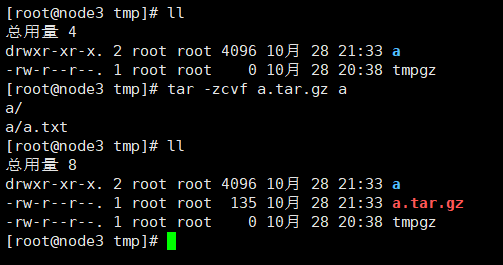 范例:在/tmp目录下创建a目录,然后在a目录下创建文件a.txt,通过tar -zcvf a.tar.gz a 命令将a目录压缩为a.tar.gz文件
