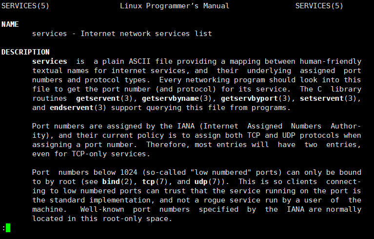 范例2:查看配置文件 services 的帮助信息:man services。